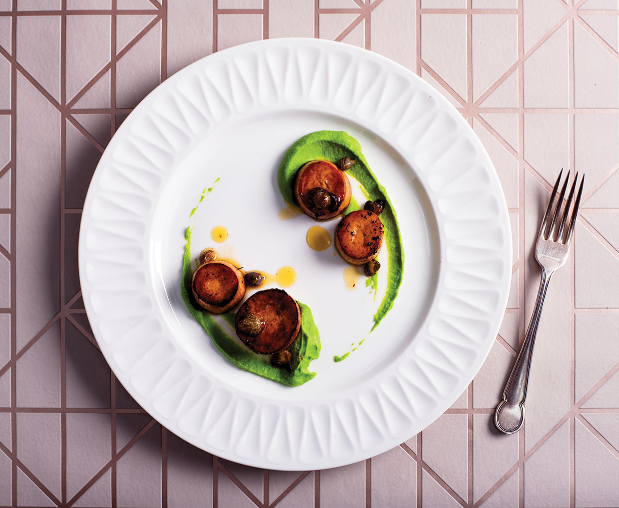 Vegan King Oyster Mushroom ‘Scallops’ with Pea Puree and Caper Beurre Noisette