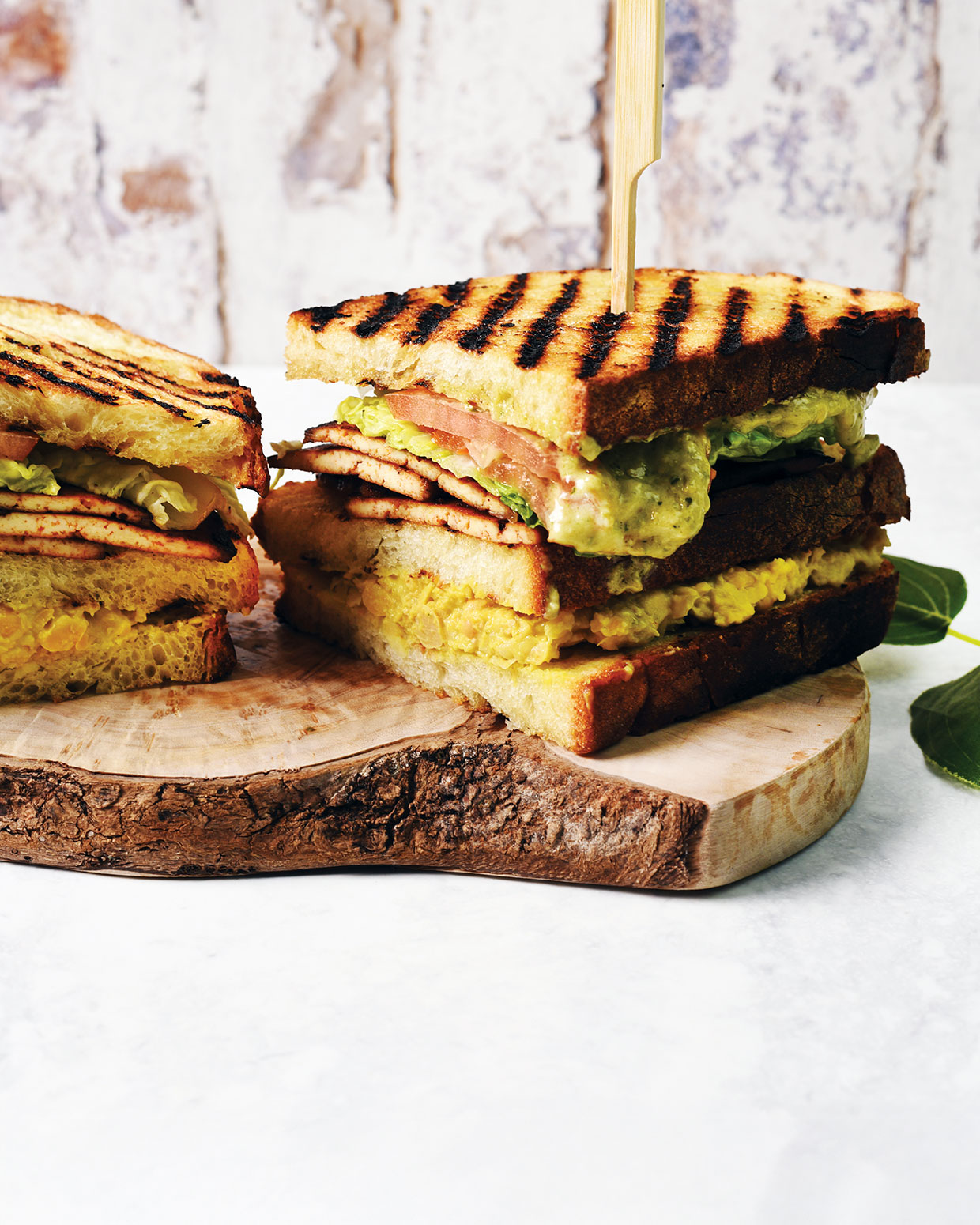 Lay one slice of toast, then a layer of ‘egg mayo’, then one other slice of toast, then layer the tofu bacon slices, lettuce leaves and sliced tomato. Then unfold a layer of the pesto mayonnaise onto the ultimate slice of toast and place, unfold aspect down, on the highest.