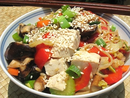 - Add the scallions, shiitakes, and cabbage. Cook dinner one other 3 minutes, or till greens are tender. Add the tofu and gently combine within the noodles and all remaining sauce.