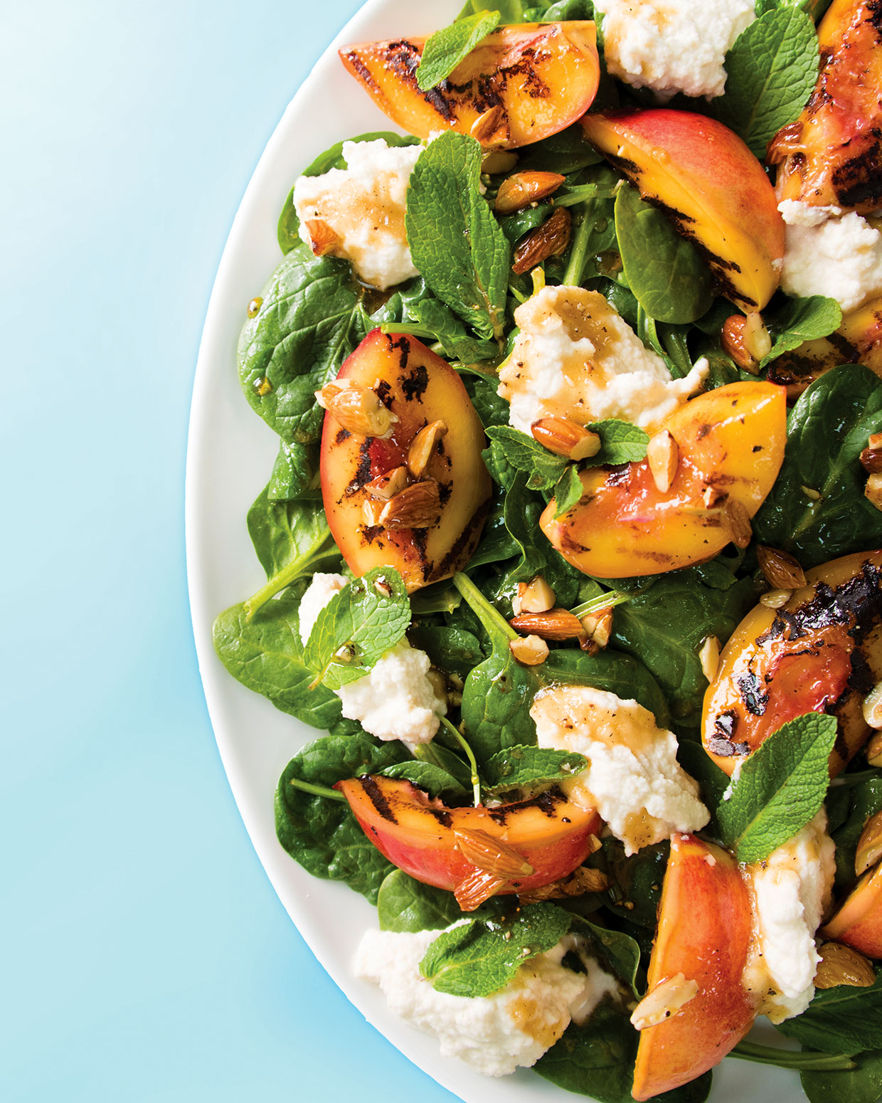 By searing recent nectarines on a sizzling griddle (or barbecue), you intensify their pure sweetness whereas including a touch of smoky flavour that tastes scrumptious with the creamy vegan ricotta and recent child spinach. To convey all of it collectively, douse the salad within the heat maple and garlic dressing, which incorporates toasted, entire almonds for a satisfying crunch.